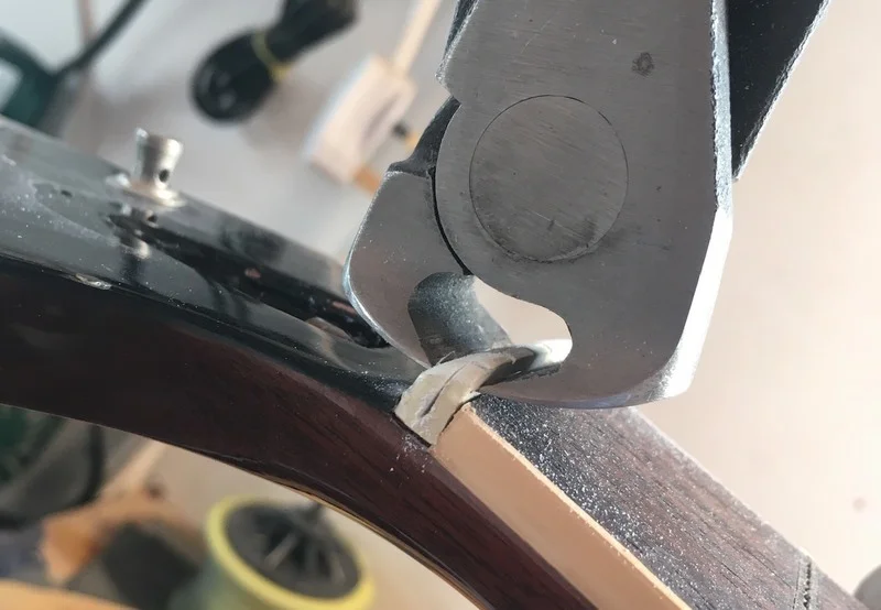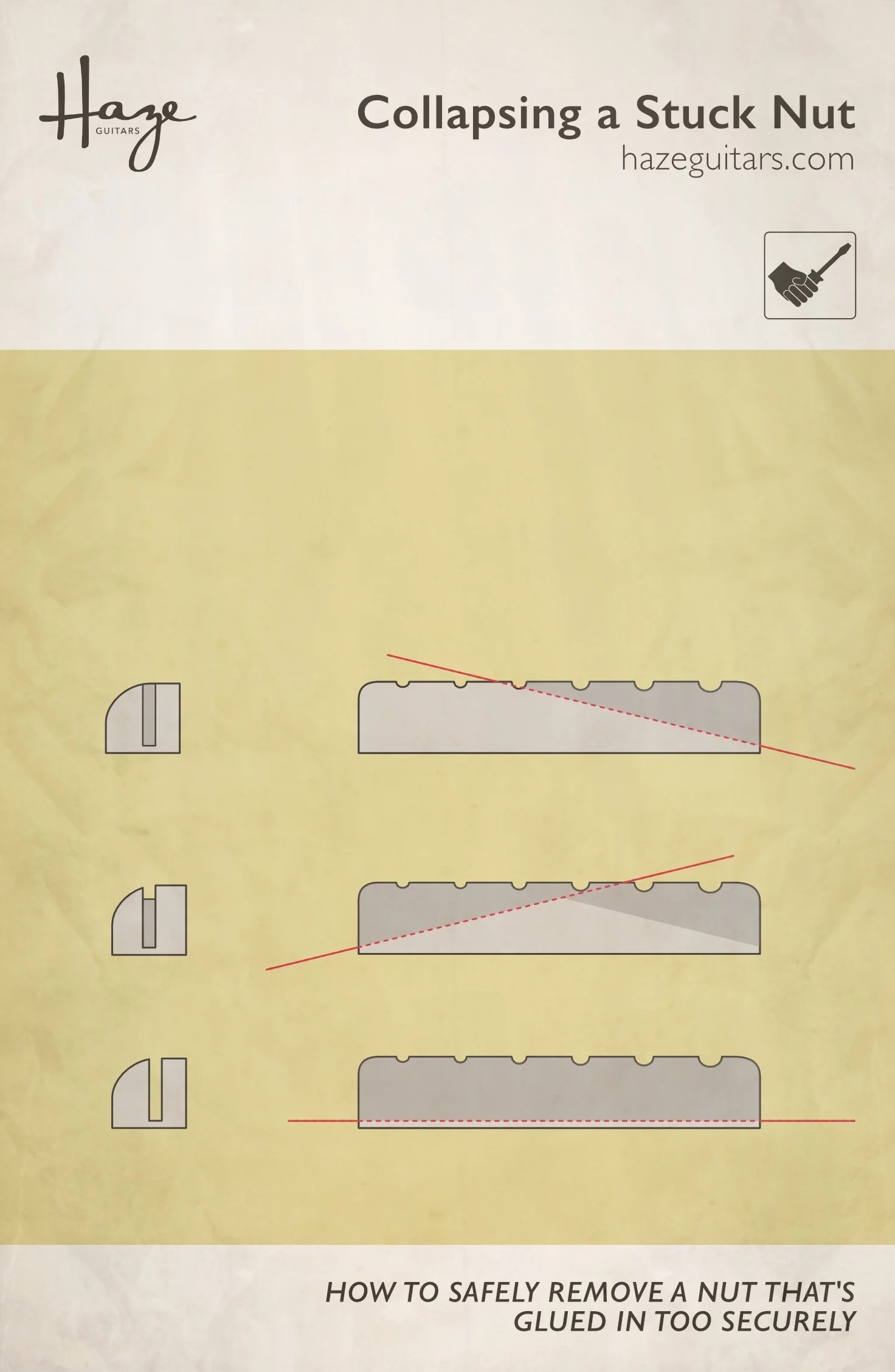 When you’re fitting your new nut, remember it should be snug but not wedged in so tightly the next guy needs to collapse it. And don’t deluge the slot in glue. You only need a tiny amount of glue to keep the nut in place.